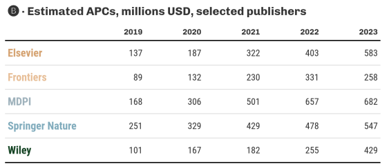 En ce qui concerne les revenus provenant des APC (frais de publication, dans le modèle auteur-payeur), ils ont également explosé ces dernières années. Qui aurait pu le prédire ?