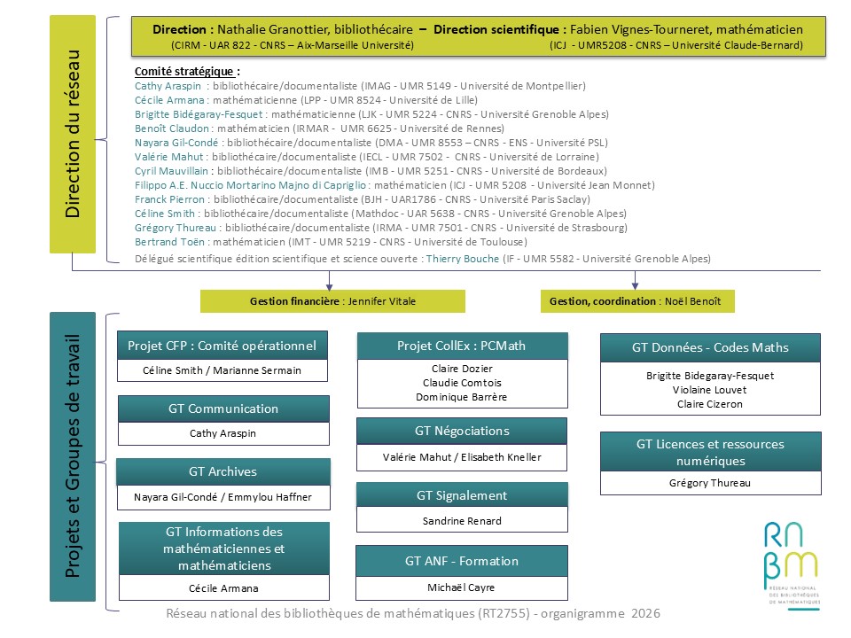 Un Bureau – constitué de chargés de mission, bibliothécaires, documentalistes ou mathématicien(ne)s, mandatés par l’INSMI – assistait l’équipe de direction du réseau (cf. la charte de fonctionnement du RNBM).